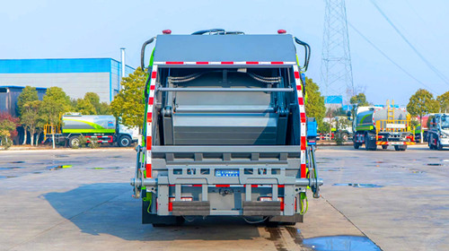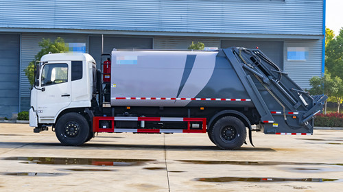 東風(fēng)多利卡D9壓縮式垃圾車改裝容積10~12m3,選用3950和4500兩種軸距底盤,箱體采用邊4底5、Q235碳鋼板,帶有前推板和刮板,帶有污水箱。雙向壓縮,標配帶掛桶反轉(zhuǎn)機構(gòu),可選其他樣式后翻轉(zhuǎn)。
